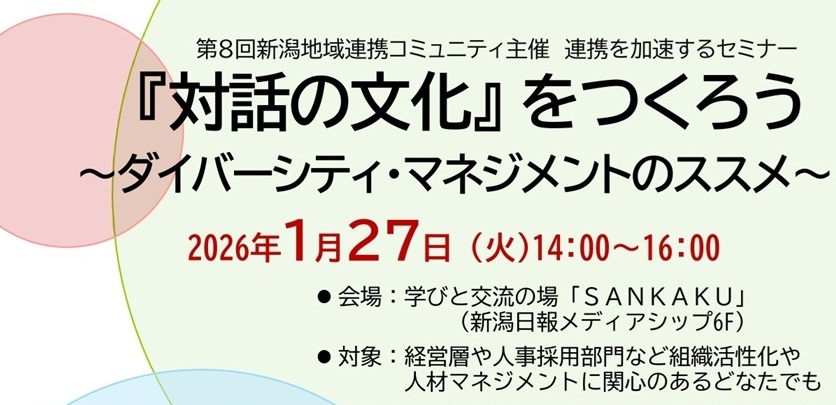 産金官学が連携し、新潟県における若者雇用・定着、地域人材の育成に取り組んでいます。オープンカンパニーをはじめとしたキャリア支援プログラムなど、学生と企業・地域とをつなぐ機会を提供し、また会員機関同士の交流、情報共有、勉強会等などを通じ、学んでよし、働いてよしの新潟を目指して活動しています。
