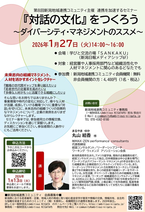2026年1月27日(火)、新潟地域連携コミュニティ主催 第8回 連携を加速するセミナー「『対話の文化』 をつくろう ~ダイバーシティ・マネジメントのススメ~」を開催し、様々な業種の企業や大学から12名が参加しました。 『連携を加速するセミナー』は、産官学連携による地域活性化、新潟の若者雇用に向けた先進的な取り組み事例を共有し、地域課題解決やビジネス創出を目指すセミナーです。