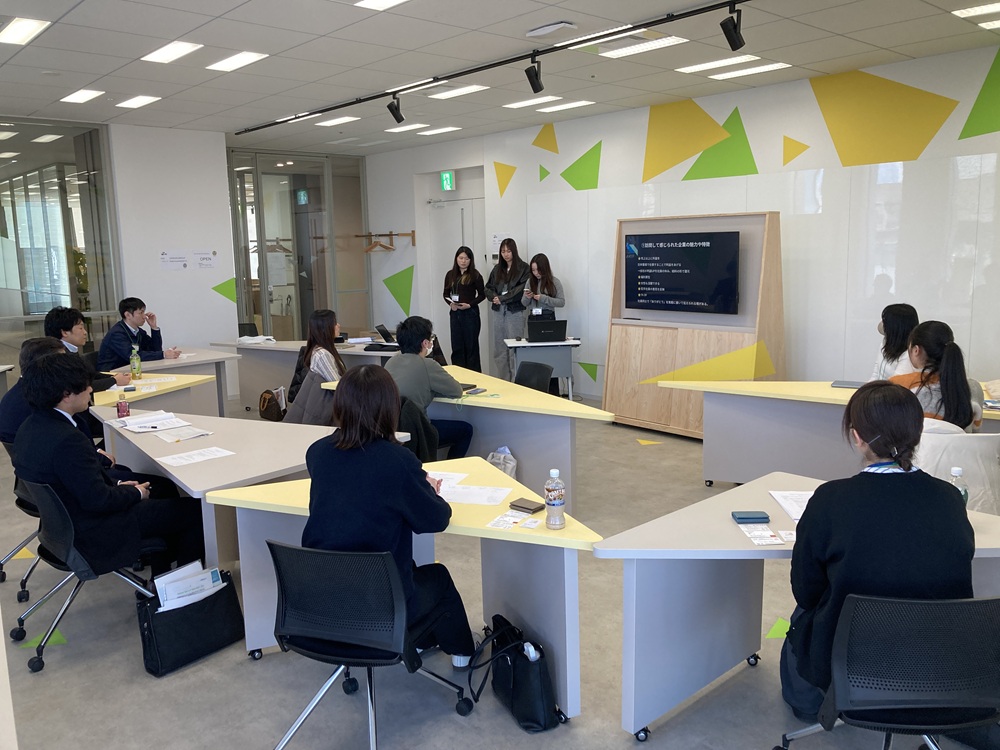 最終日の成果報告会では、訪問して知った「企業の仕事・社風・働き方」と「自分の仕事観」との接点について検討し、企業の方々にお越しいただきグループで発表しました。